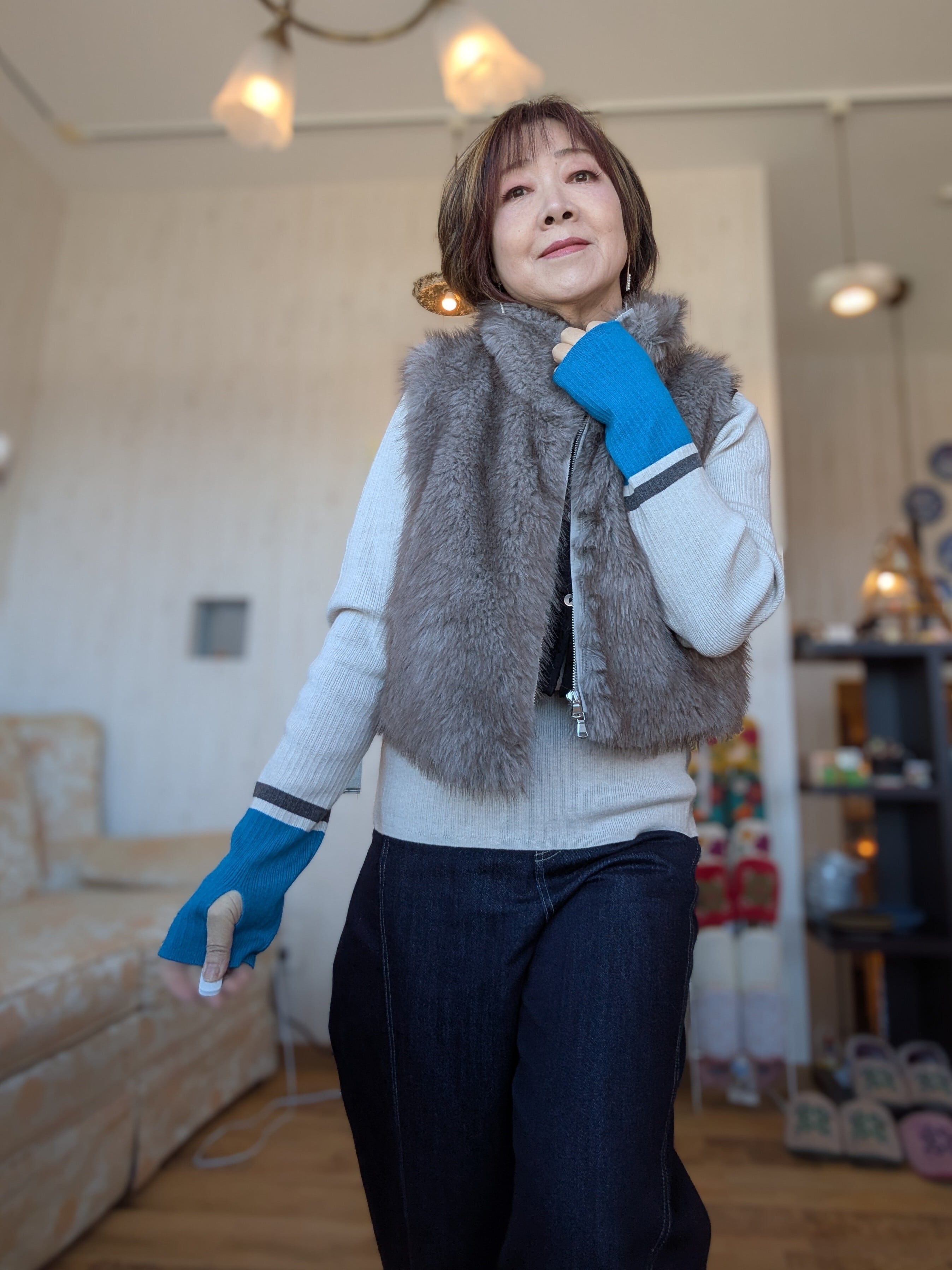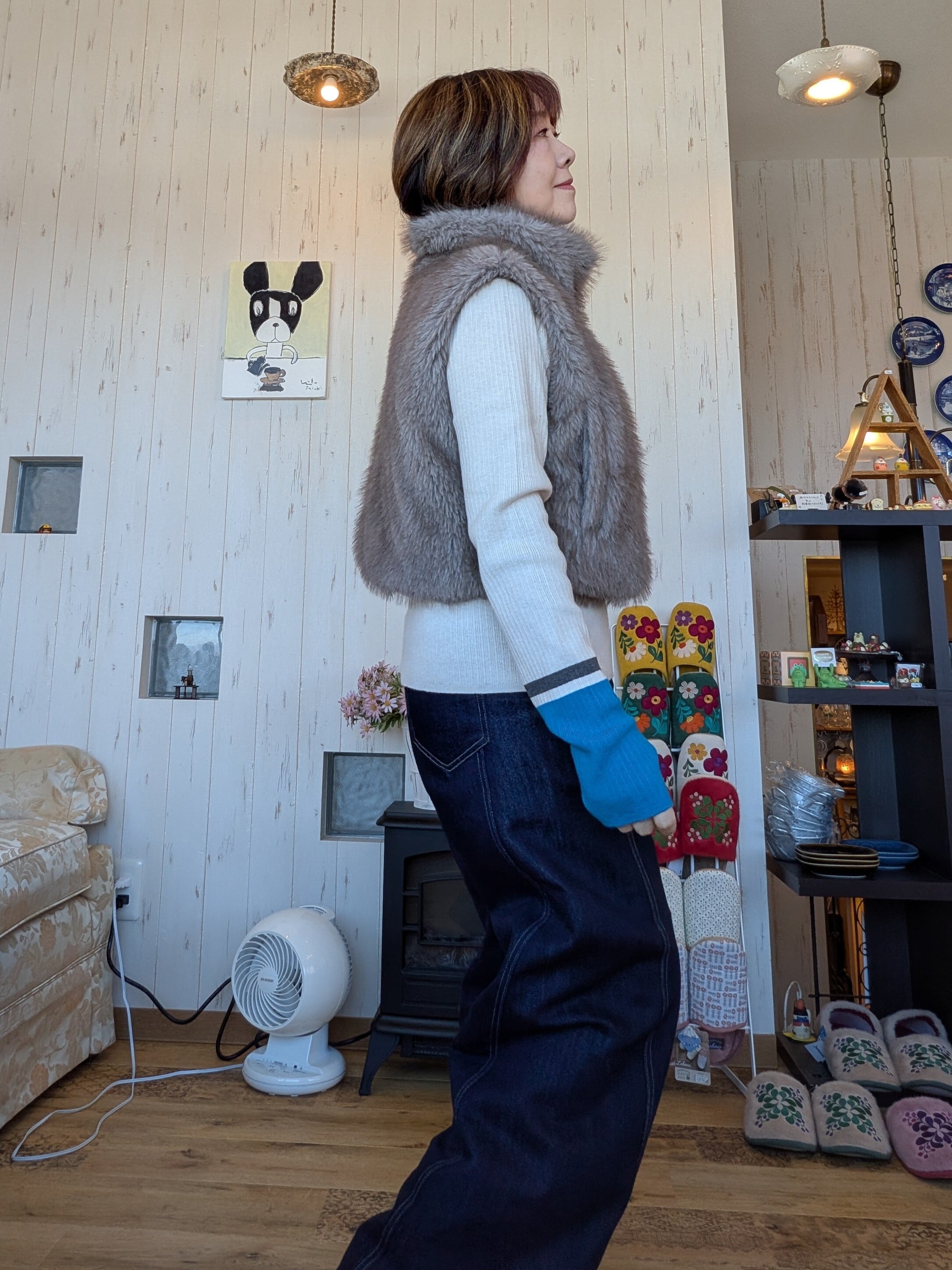 また、タートルネックとデニムの組み合わせに上から羽織っても。