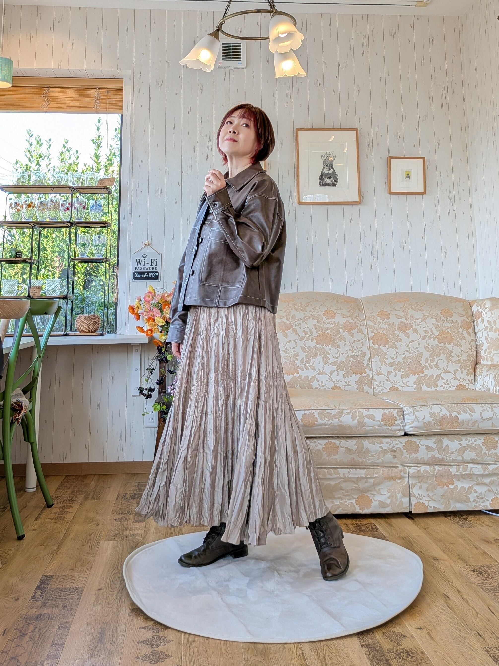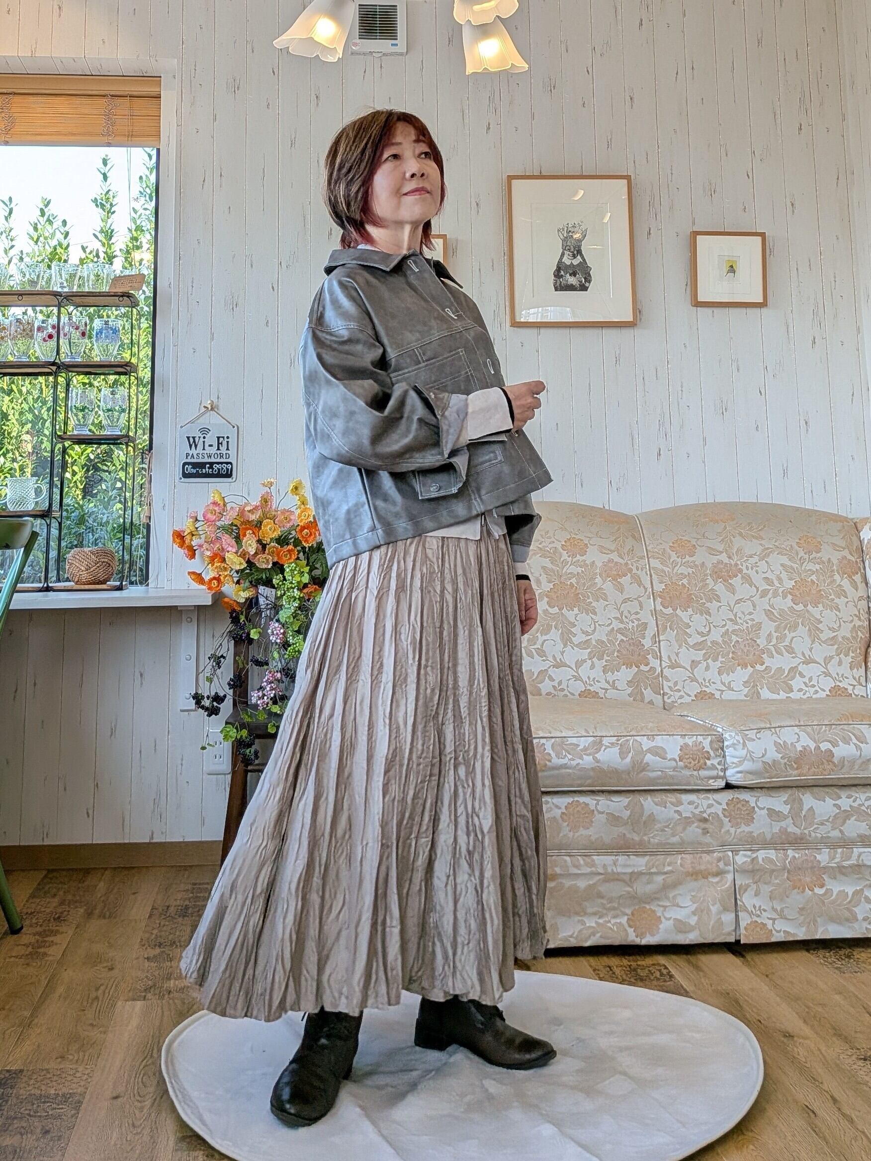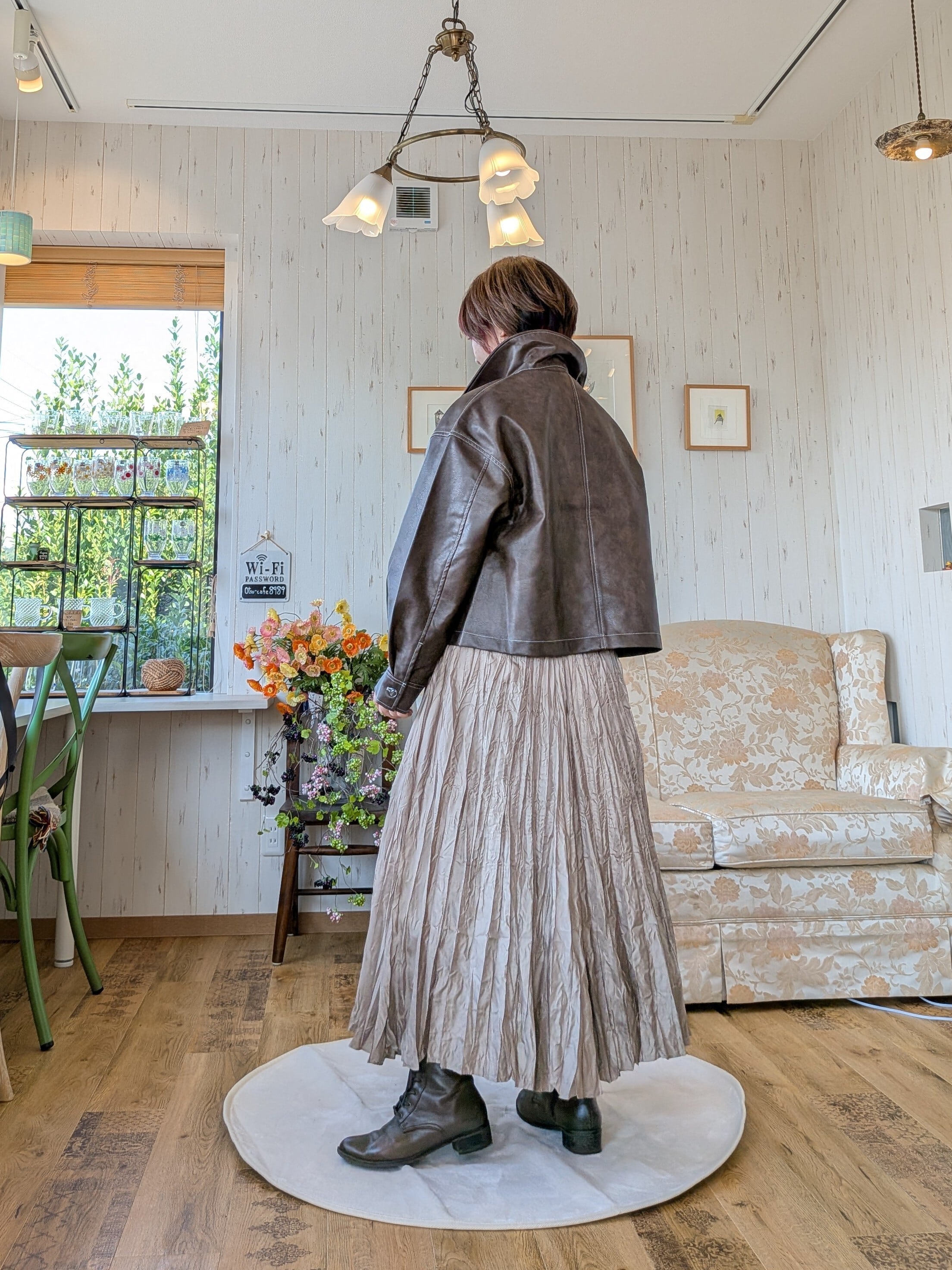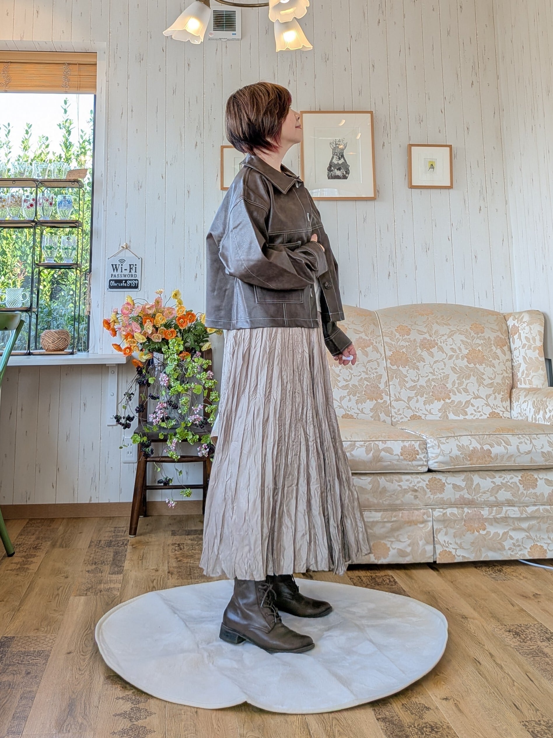 スカートやワンピースに合わせれば甘辛の対比がかえってフェミニンを際立たせます。