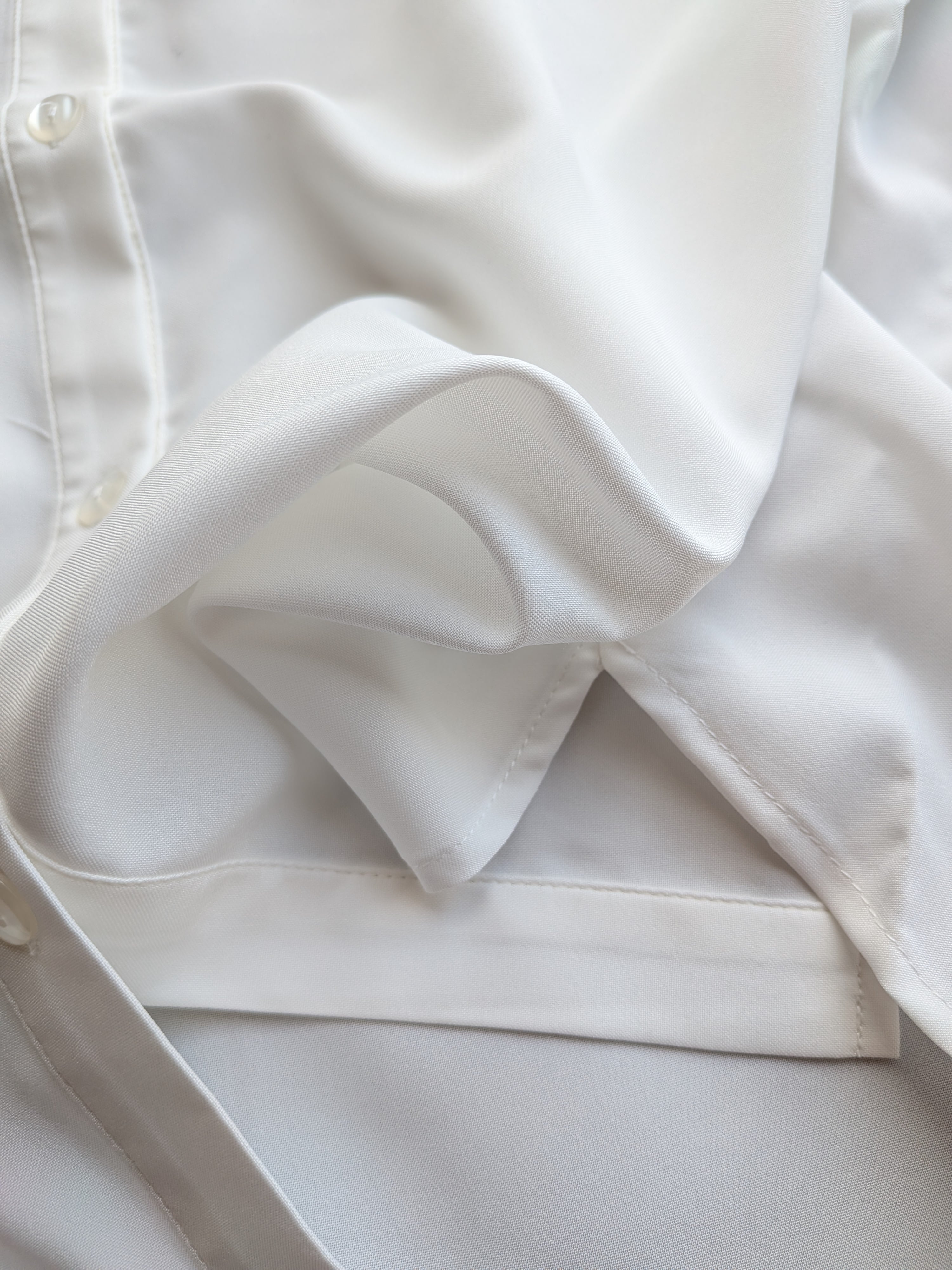 シャツはシワになりにくく落ち感の良いポリエステル100%素材を採用。