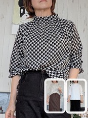 首元のギャザーデザインがさりげなく女性らしさを演出し、